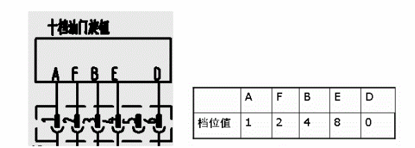 ①上圖為十檔油門旋鈕的原理和各導線代表的數值,其中D(6腳)與車架地相連作為參考,當十檔油門旋鈕轉動時,如果A(l腳)、F(2腳)、B(3腳)、E(4腳)與D(6腳)導通則顯示上述檔位值或相加所得檔位值。如:F(2腳)、B(3腳)與D(6腳)導通則表示工作在6檔。